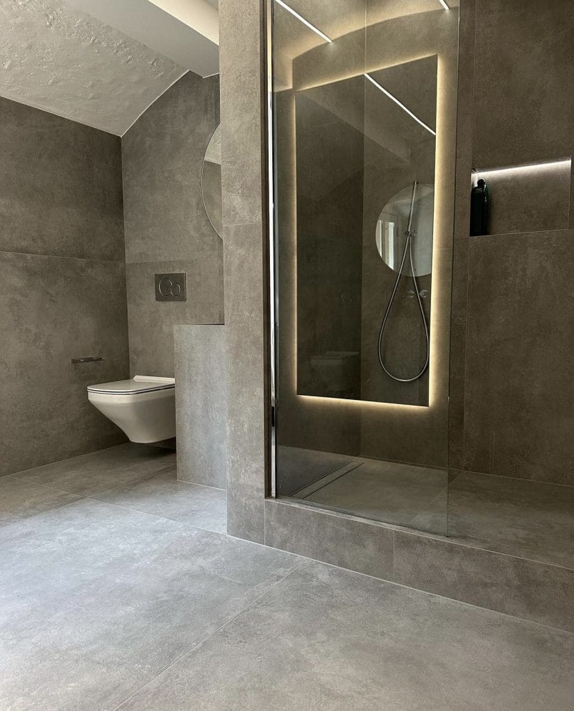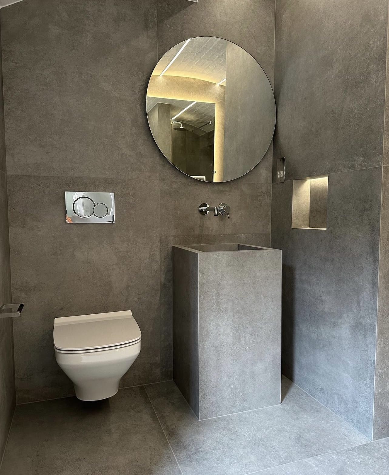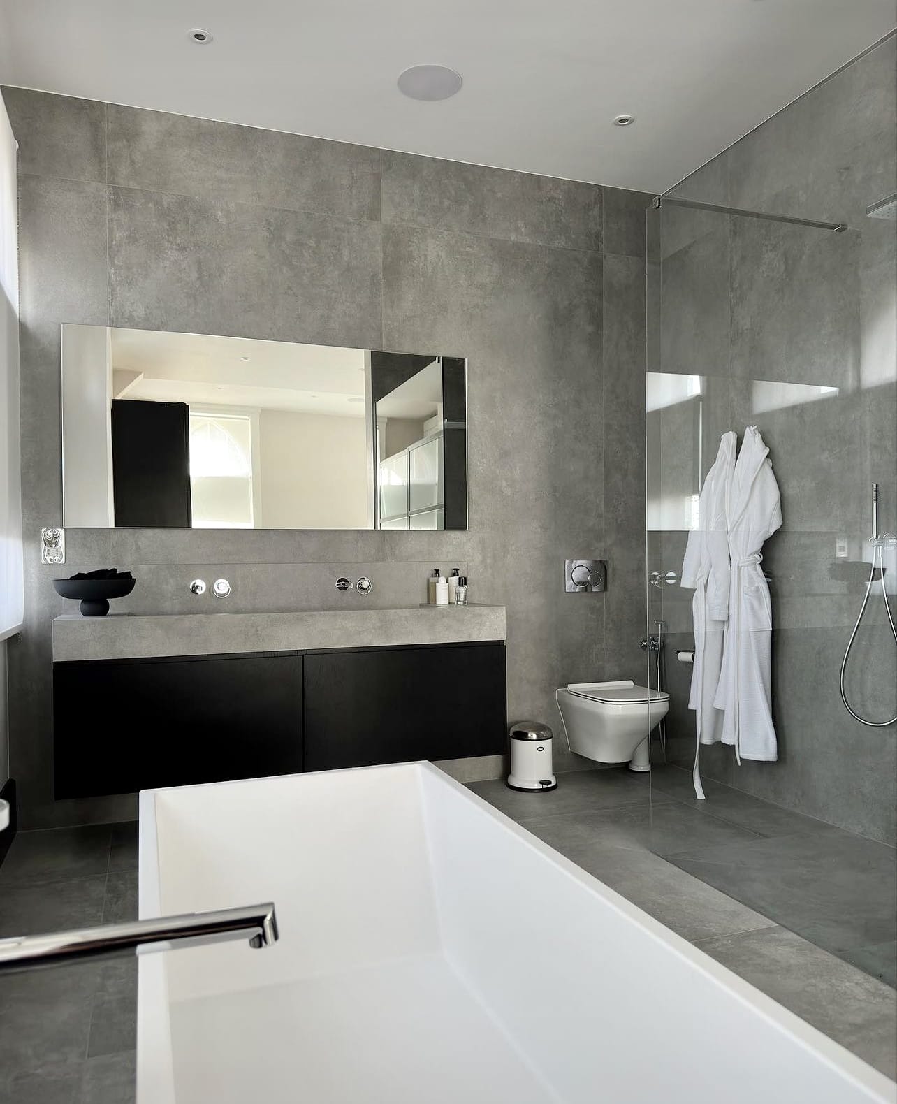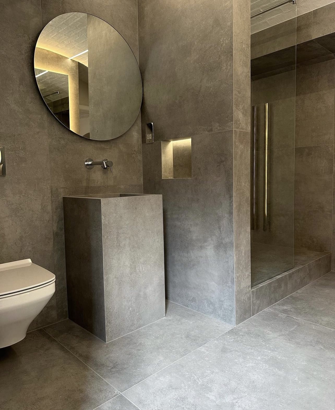 Our team at Living Space left no stone unturned, crafting every architectural detail and finish in this very simplistic modern bathrooms. The customer brief was simple Modern clean lines we feel we have achieved this through our bespoke-made freestanding basin finished off with concrete effect tiles.