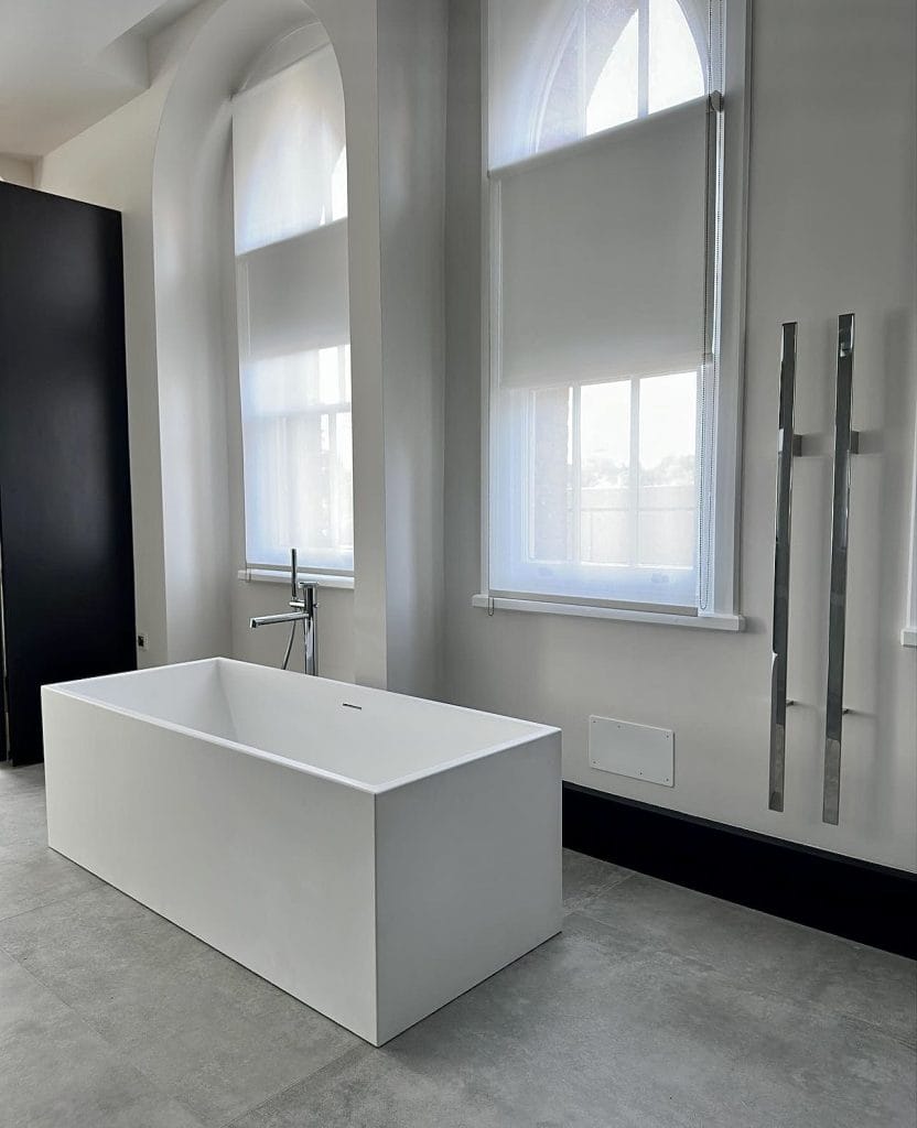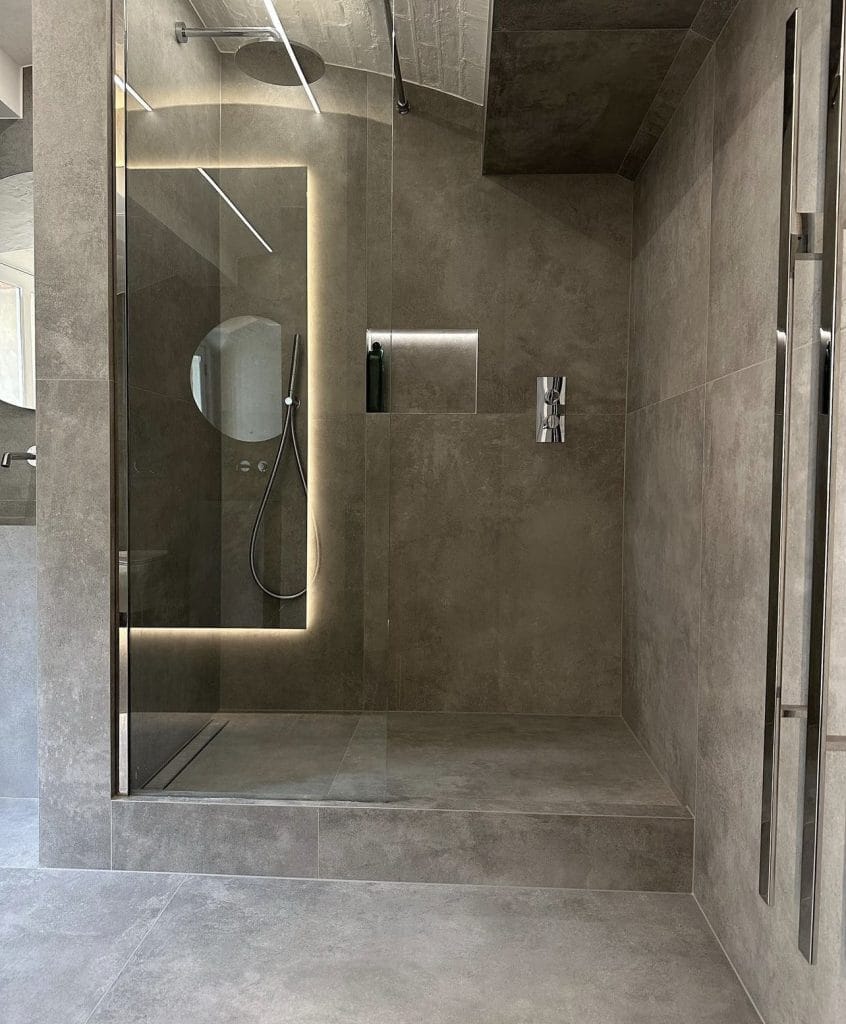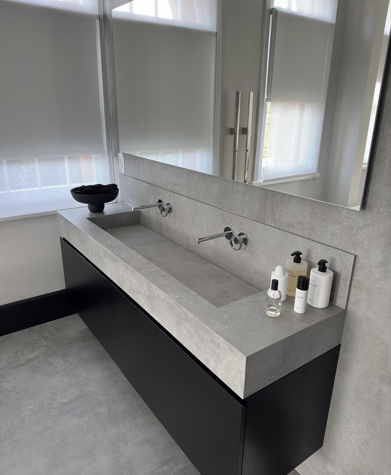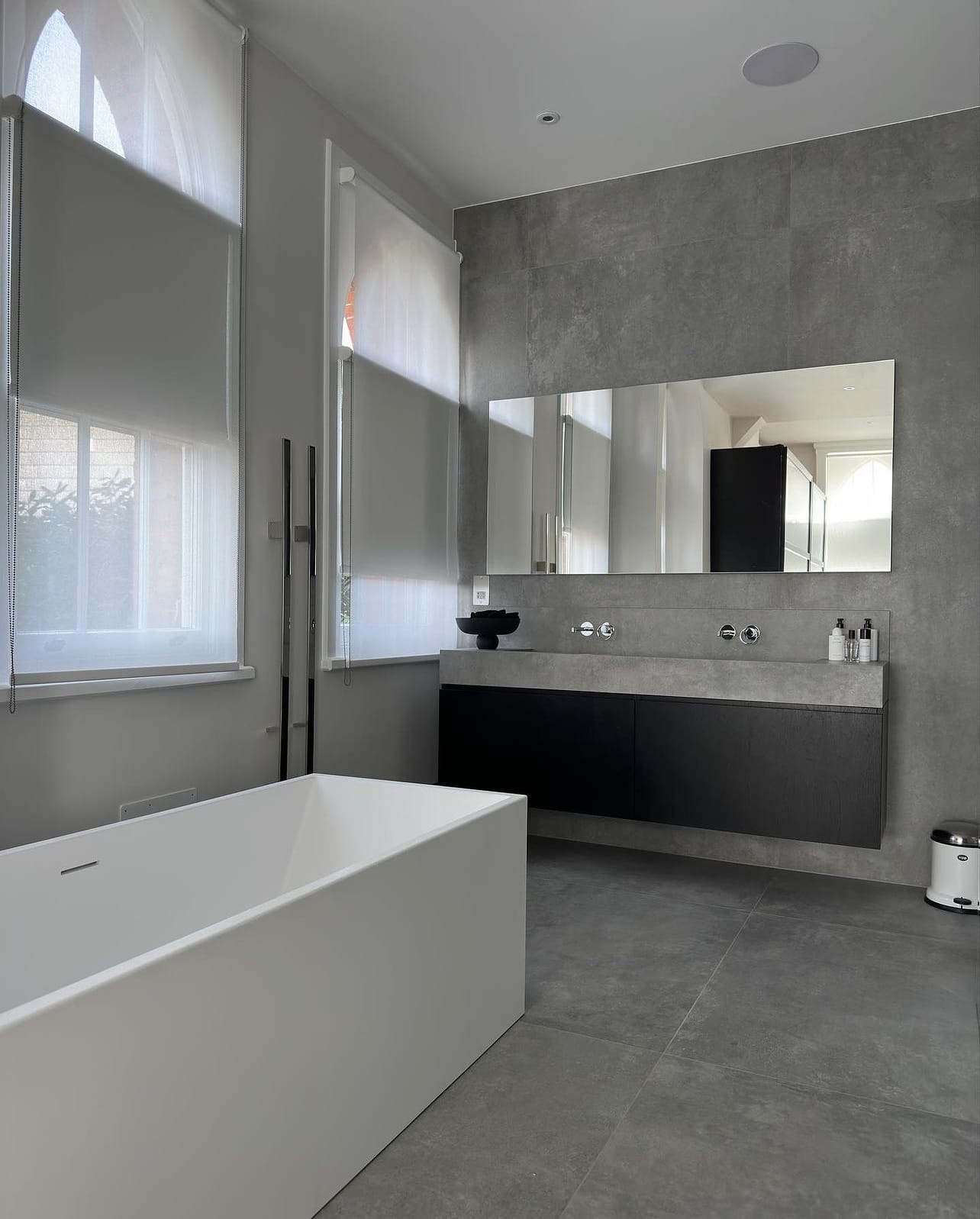 Our team at Living Space left no stone unturned, crafting every architectural detail and finish in this very simplistic modern bathrooms. The customer brief was simple Modern clean lines we feel we have achieved this through our bespoke-made freestanding basin finished off with concrete effect tiles.