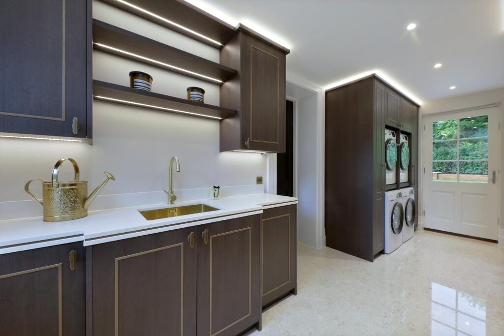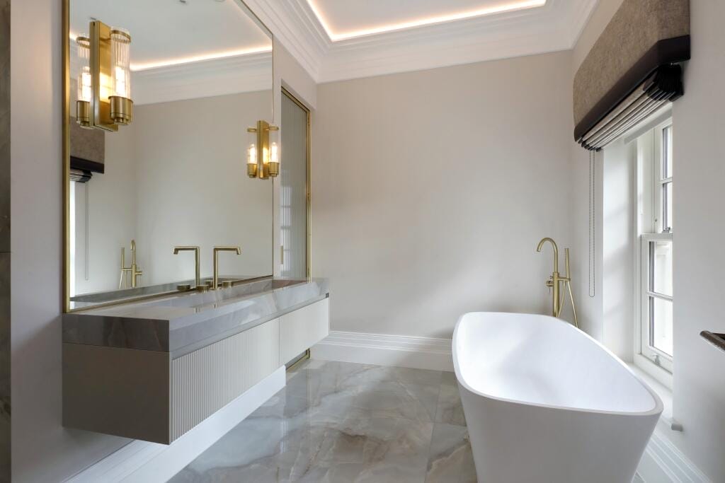Brushed brass fittings and a minimalist glass shower enclosure complete the look, harmonizing modern luxury with timeless sophistication. This bathroom stands as a showcase of bespoke design and material mastery, where every element has been thoughtfully crafted for both beauty and function.