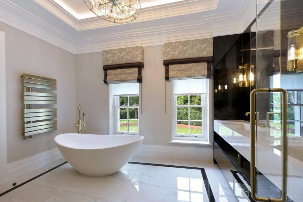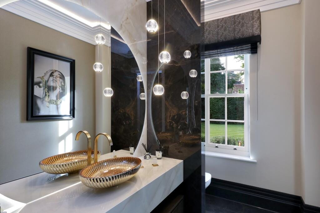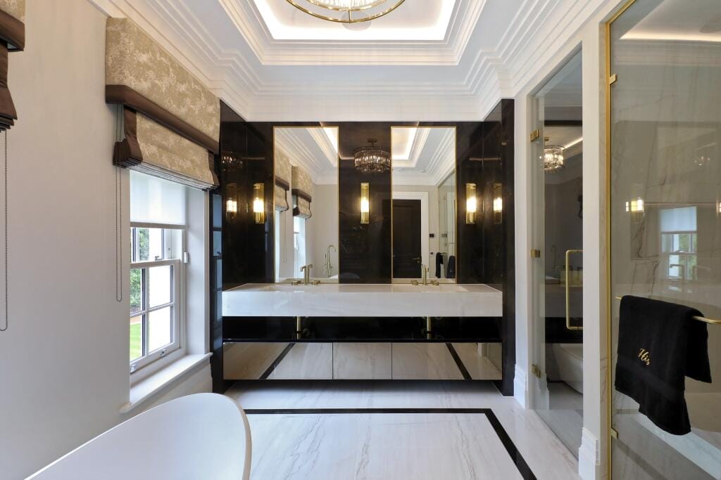 A luxurious modern bathroom with a sophisticated blend of contemporary design and classic elegance. The room features a striking black and white colour palette accented with touches of Brushed gold, creating a refined, high-end aesthetic.