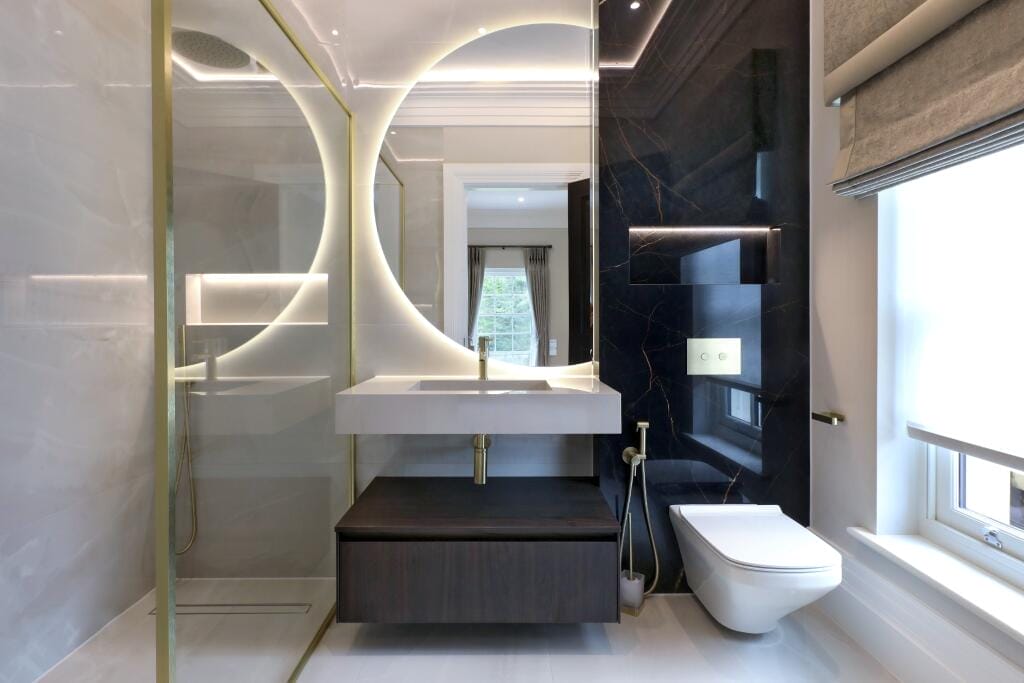 A stunning contemporary bathroom defined by its sleek design and meticulous craftsmanship. The focal point is a bespoke half-moon backlit mirror, creating a striking visual statement and enhancing the ambient glow of the space. Beneath it sits a custom-made porcelain basin, beautifully fabricated in-house by the design team, exemplifying precision and artistry.