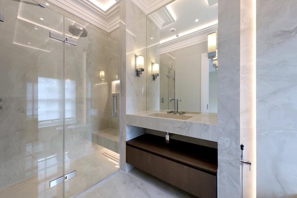 Discreet led lighting runs vertically along the marble wall, adding a warm glow that enhances the natural texture of the stone. The ceiling, adorned with intricate coffered detailing and recessed lighting, reflects careful architectural craftsmanship. Chrome fixtures and modern wall mounted lights complement the clean lines and polished surfaces, reinforcing the space’s modern-luxury aesthetic.