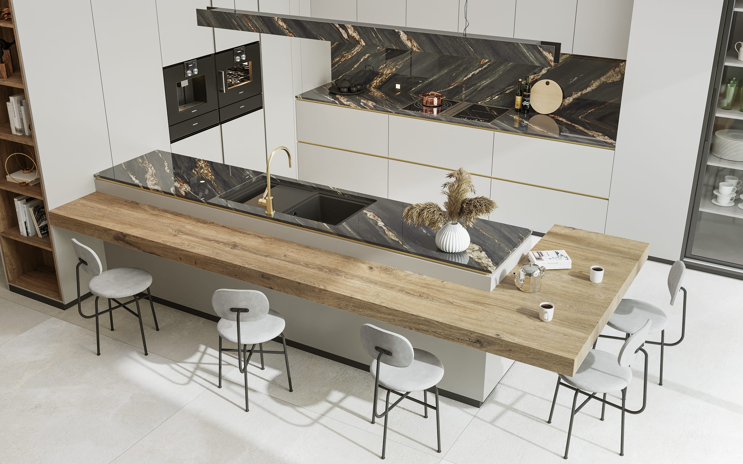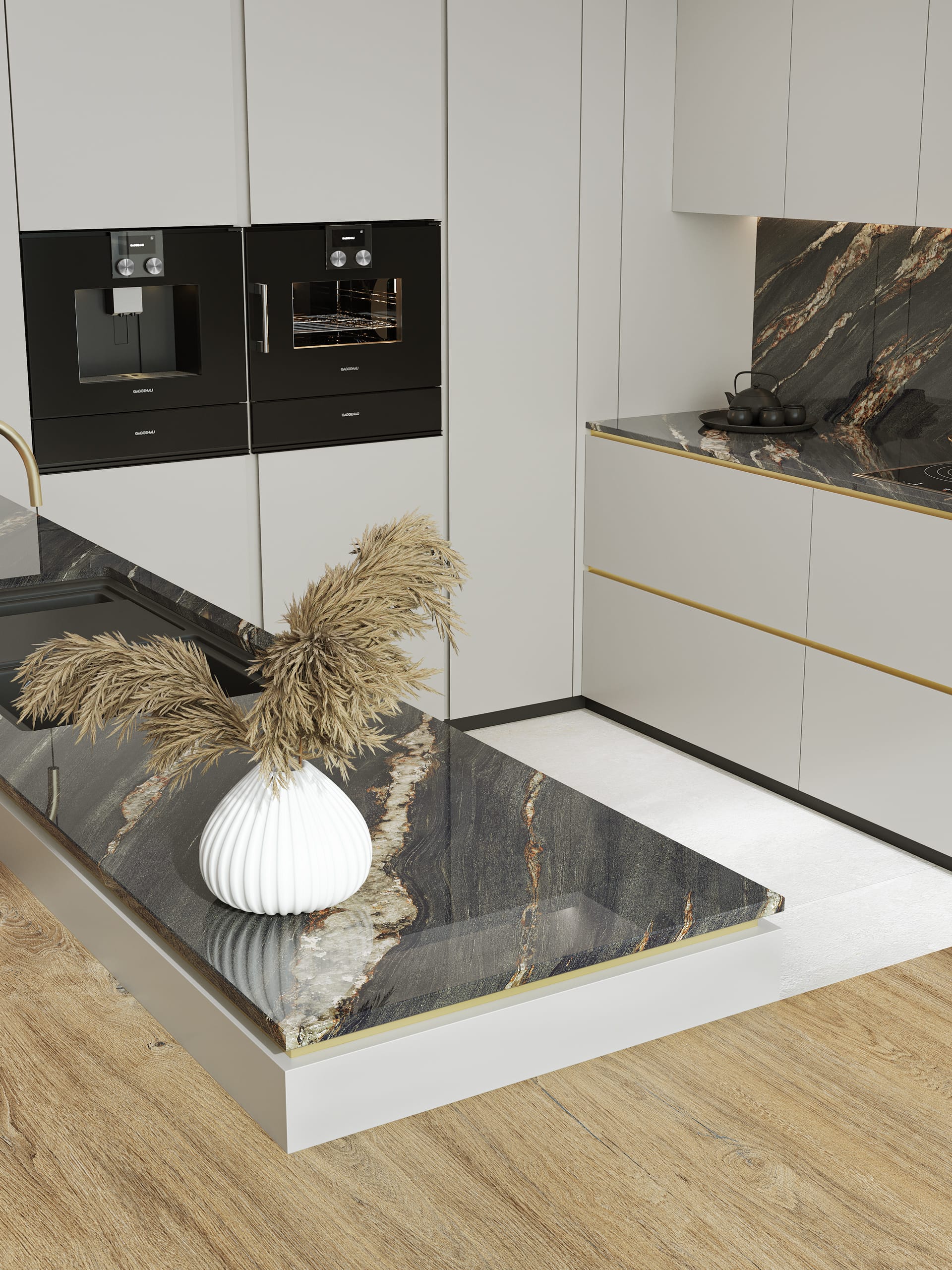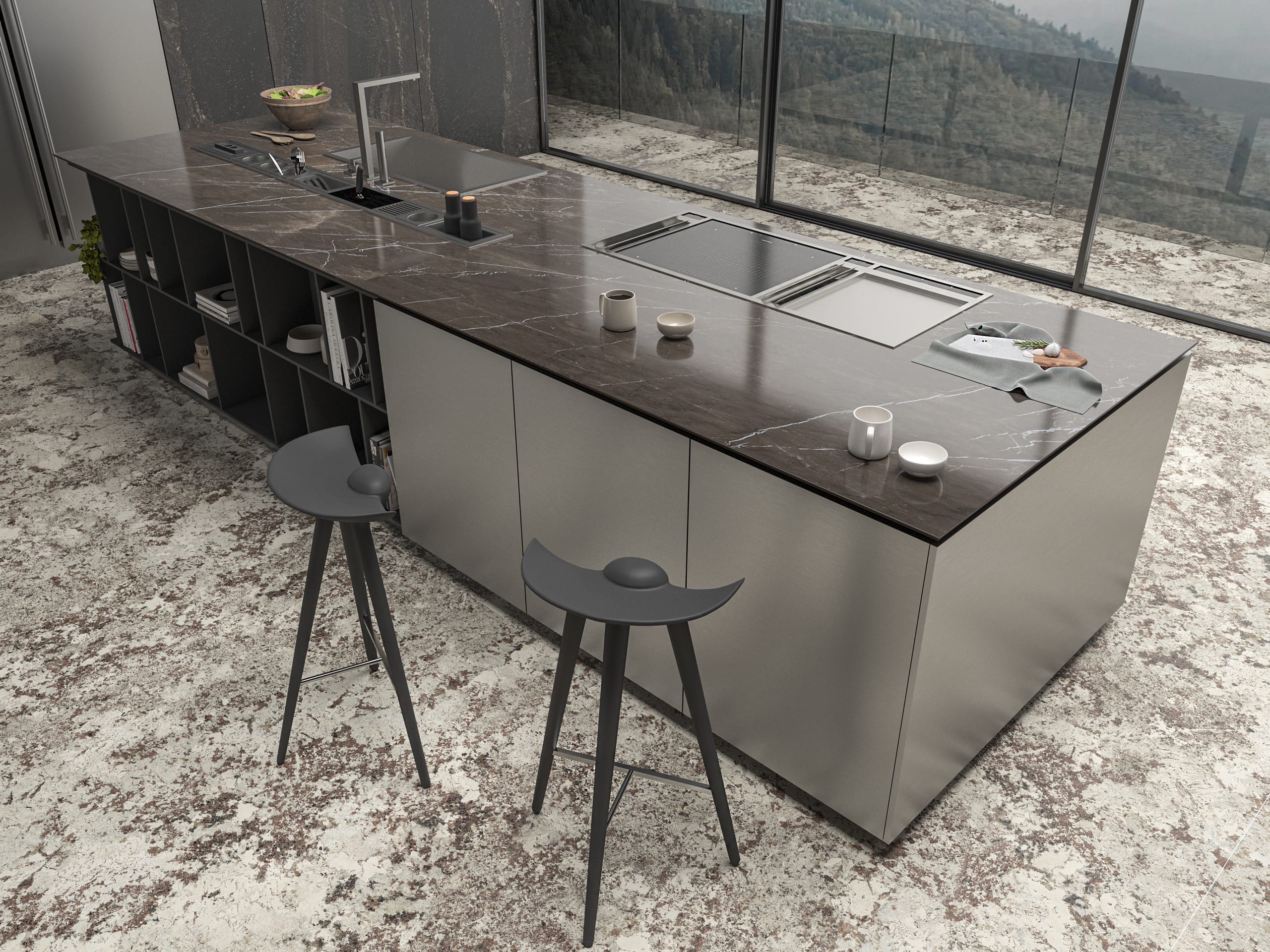 Kitchen Island Countertop is a island worktop with overhang. With the widest range of colours and designs on the market, you are sure to find the perfect porcelain countertop to match your kitchen. Island countertops are designed to be installed over cabinetry or above an existing base or island (not supplied). Tops are supplied in 12 mm, 20 mm or 30-100 mm thicknesses with vein matching where appropriate. Uninterrupted lengths up to 3000 mm and widths of 1500 mm are manufactured without a join, while laser templating ensures that cut-outs for sink, hob, taps and electrical sockets are accurately positioned. Finally an overhang of up to 700 mm can be specified for occasional seating. Island countertops are priced per square metre. Kitchen Island Countertop is manufactured at our design studio in approximately 6-10 weeks. Each item is made-to-order and can be specified with an array of colours and styles. Please see specification below. The sizes shown are representative only, as your item will be made to your specific size and fitment requirements. Parameters for width, height and depth (w x h x d) measurements are quoted as a guide.