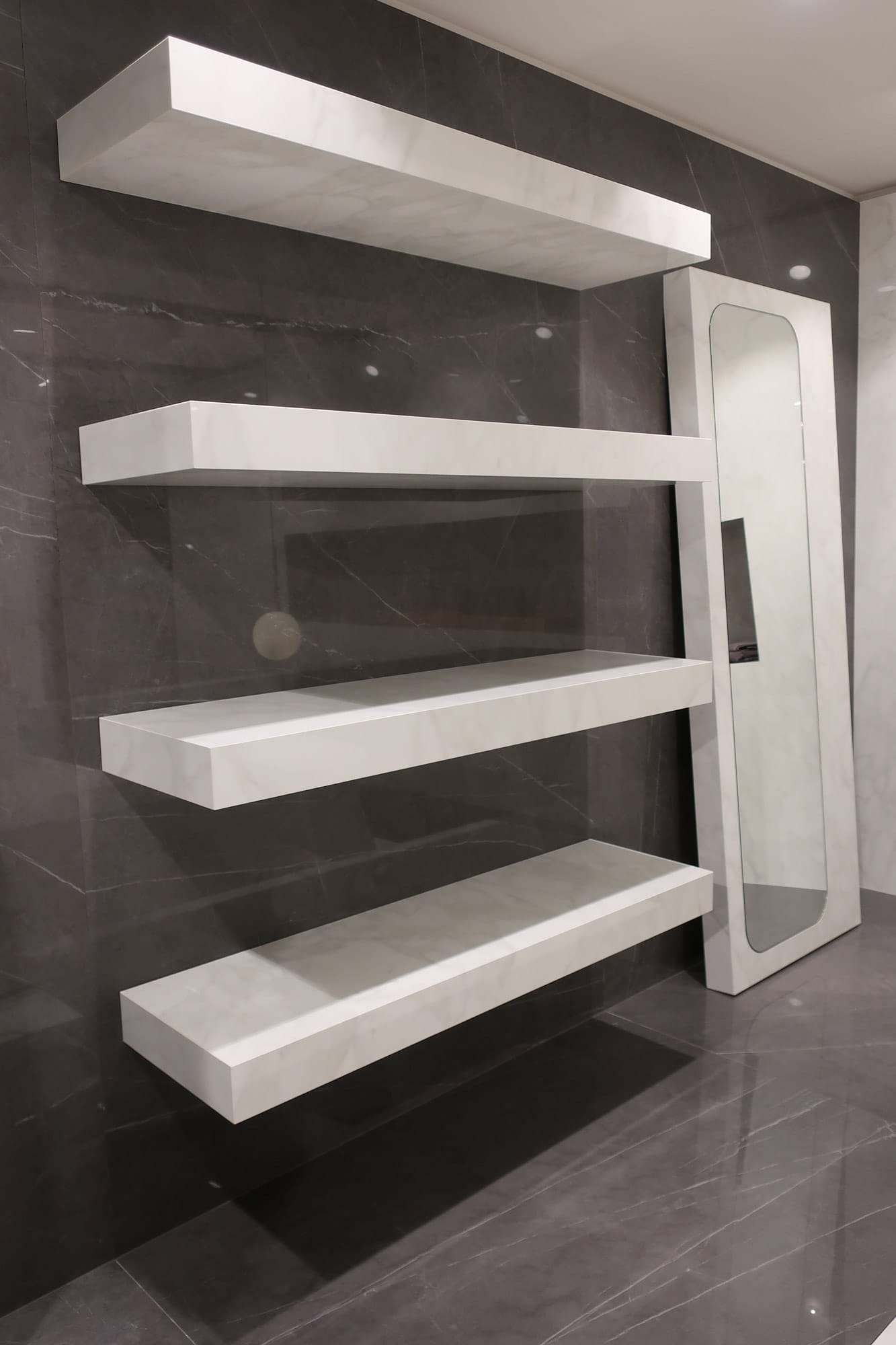 Kitchen Shelf is a wall-mounted configurable shelf unit. Choose from 40 mm to 50 mm in height, these shelves are wall-mounted and can be prepared to your specification for floating or recess fitment. Kitchen Shelf is manufactured at our design studio in approximately 6-10 weeks. Each item is made-to-order and can be specified with an array of colours and styles. Please see specification below. The sizes shown are representative only, as your item will be made to your specific size and fitment requirements. Parameters for width, height and depth (w x h x d) measurements are quoted as a guide.