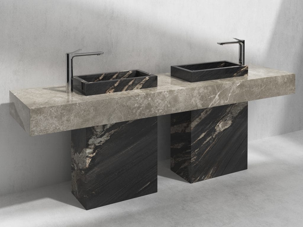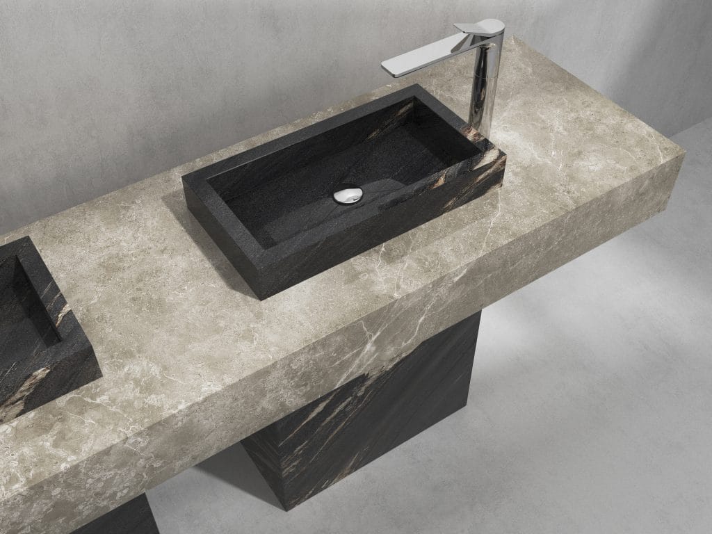 Saturn is a luxury free-standing double basin. It features an integrated vanity top and can be specified with two complimentary surface styles, one for the vanity top and one for the double sink and base units. This basin is suitable for wall or deck-mounted tap systems. Saturn is manufactured at our design studio in approximately 6-10 weeks. Each item is made-to-order and can be specified with an array of colours and syles. Please see specification below. The sizes shown are representative only, as your item will be made to your specific size and fitment requirements. Parameters for width, height and depth (w x h x d) measurements are quoted as a guide.