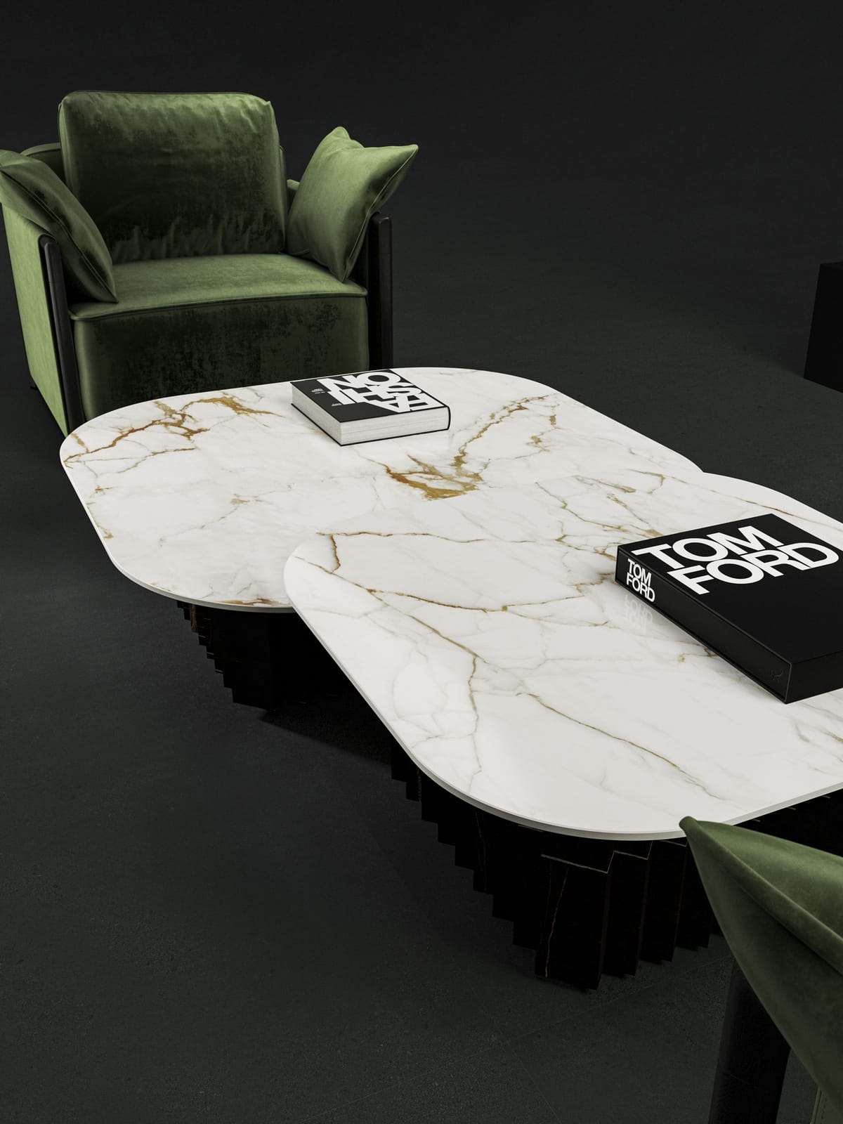 Tavolino Origami is a coffee table with greca decor. The Tavolino Origami is a refined and stylish piece of furniture, designed to add a touch of playfulness and modernity to any living space. Available in two complementary sizes, this table is dressed in a striking contrasting colourway, making it a striking focal point in any room. The Tavolino Origami features a polished white marble effect top and Sahara Noir base for a luxurious and upscale feel. For maximum impact, place two in an open living space to create a cohesive and elegant design. Tavolino Origami is manufactured at our design studio in approximately 6-10 weeks. Each item is made-to-order and can be specified with an array of colours and syles. Please see specification below. The sizes shown are representative only, as your item will be made to your specific size and fitment requirements. Parameters for width, height and depth (w x h x d) measurements are quoted as a guide.
