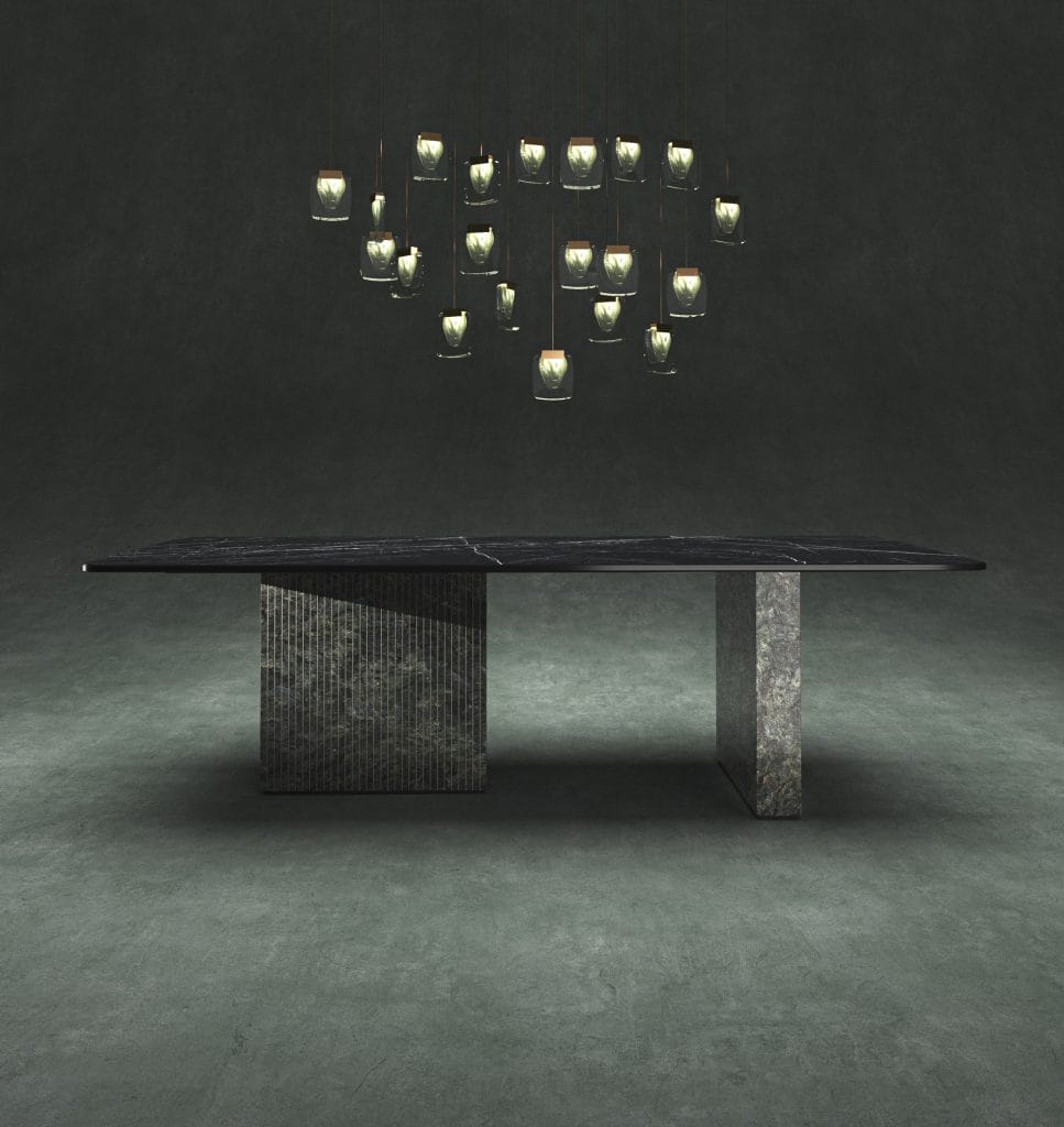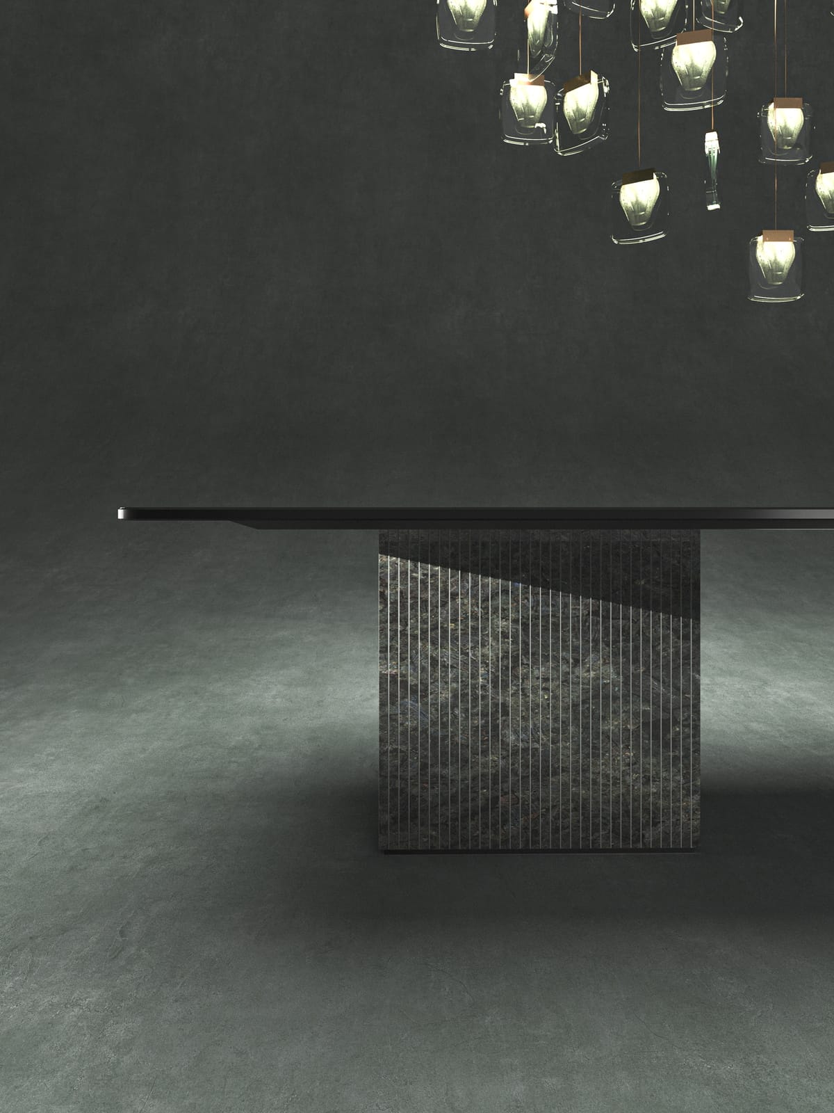 Tavolo Gessato is a fluted decor dining table. Tavolo Gessato has been designed to elevate the grandest of living spaces with its dynamic finish and striking design. The structure of this table is a masterpiece of geometric lines, culminating in a magnificent 20 mm thickness Nero Marquina top. The edges are intricately bevelled, and each piece holds its individuality due to the subtle variations within the porcelain stone. The twin rectangular base features a vertical decorative detail that adds an extra touch of elegance. A statement piece that will leave a lasting impression. Tavolo Gessato is manufactured at our design studio in approximately 6-10 weeks. Each item is made-to-order and can be specified with an array of colours and syles. Please see specification below. The sizes shown are representative only, as your item will be made to your specific size and fitment requirements. Parameters for width, height and depth (w x h x d) measurements are quoted as a guide.