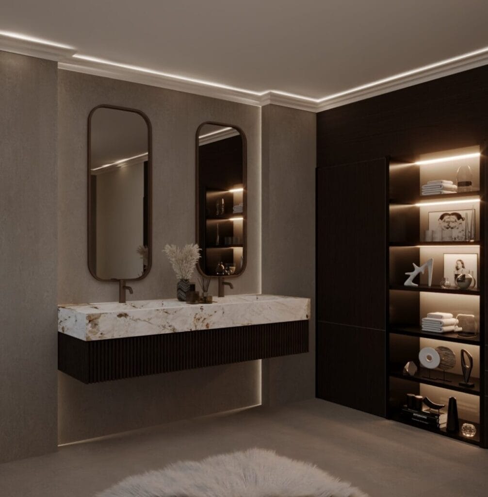 🪞 **Elegant Vanity Area** – Dual mirrors, a floating marble countertop, and custom storage solutions ensure both beauty and practicality.