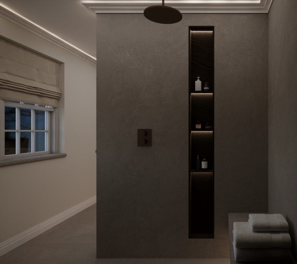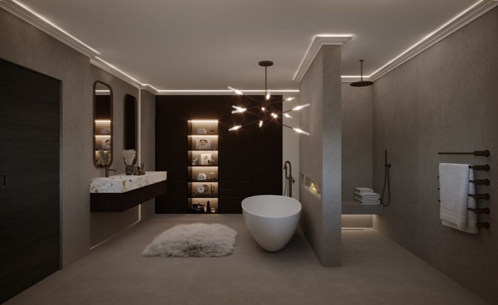 🚿 **Seamless Walk-In Shower** – Featuring rainfall showerheads, integrated shelving, and warm accent lighting for an immersive experience.