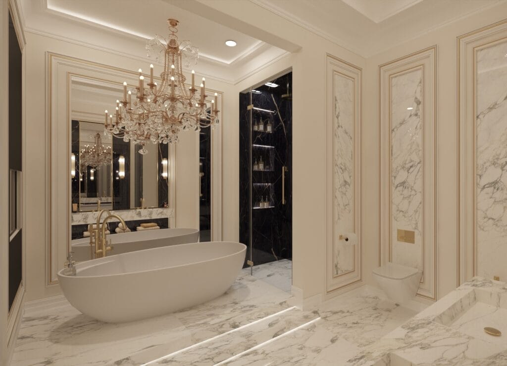 A sculptural freestanding tub sits as the focal point, framed by steps with recessed lighting that gently guides movement through the space. Overhead, a cascading crystal chandelier introduces classical grandeur and refracts soft light across the reflective surfaces.