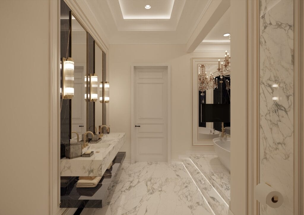 Brushed brass fixtures and wall sconces introduce warmth without overpowering, tying together the design narrative of modern opulence grounded in traditional detailing.