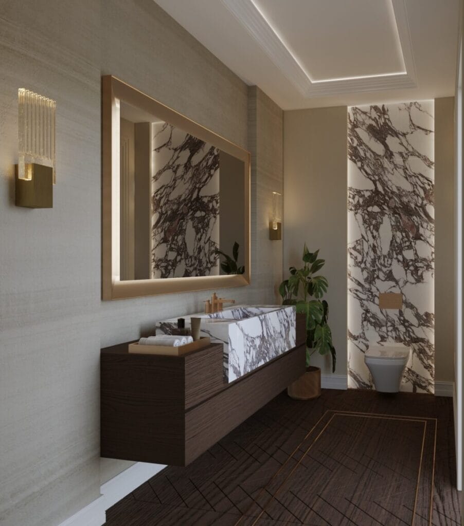 Behind the WC, a large-format marble tile serves as a contemporary focal point, seamlessly uniting the WC and basin areas with harmonious balance.