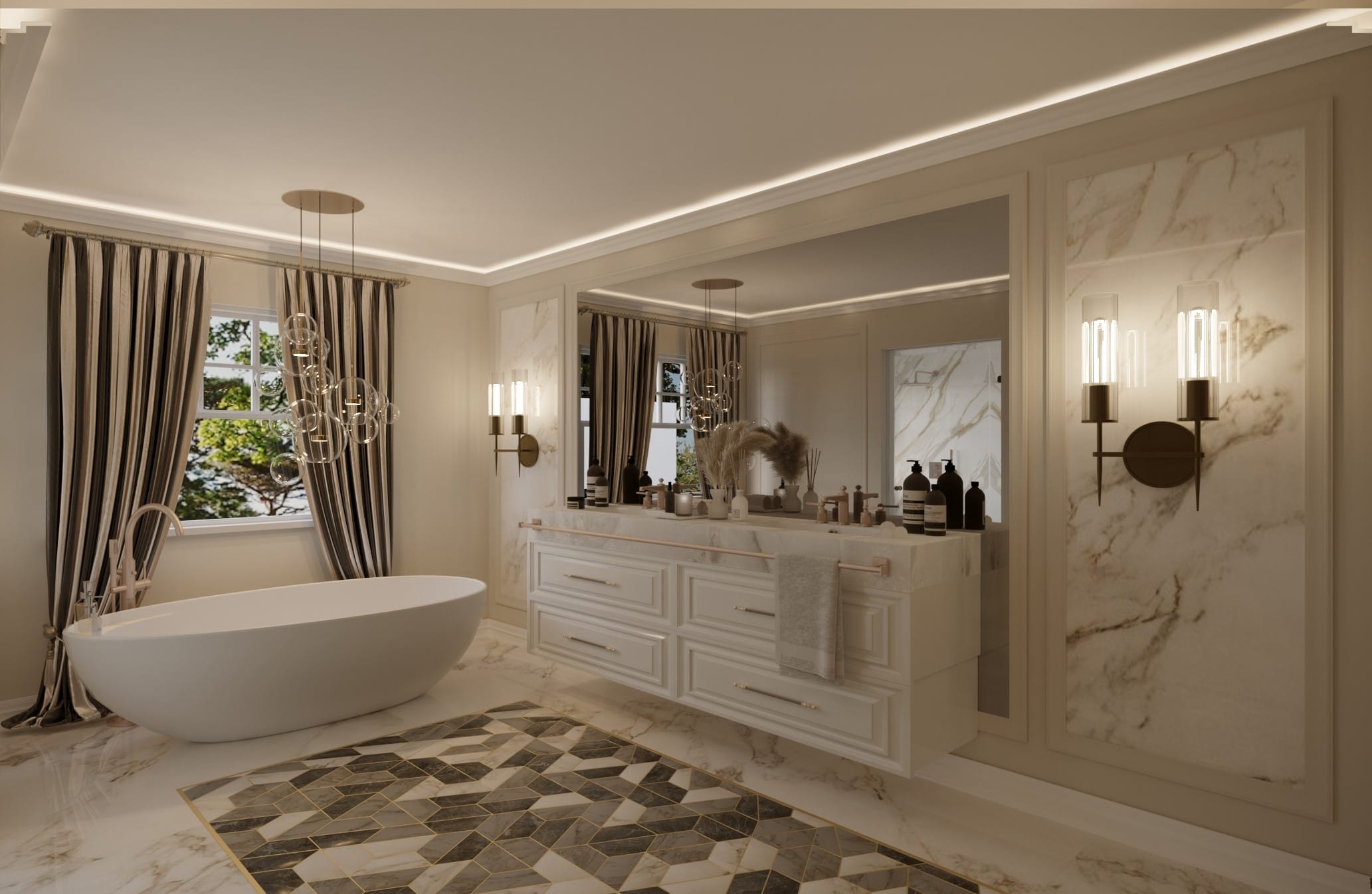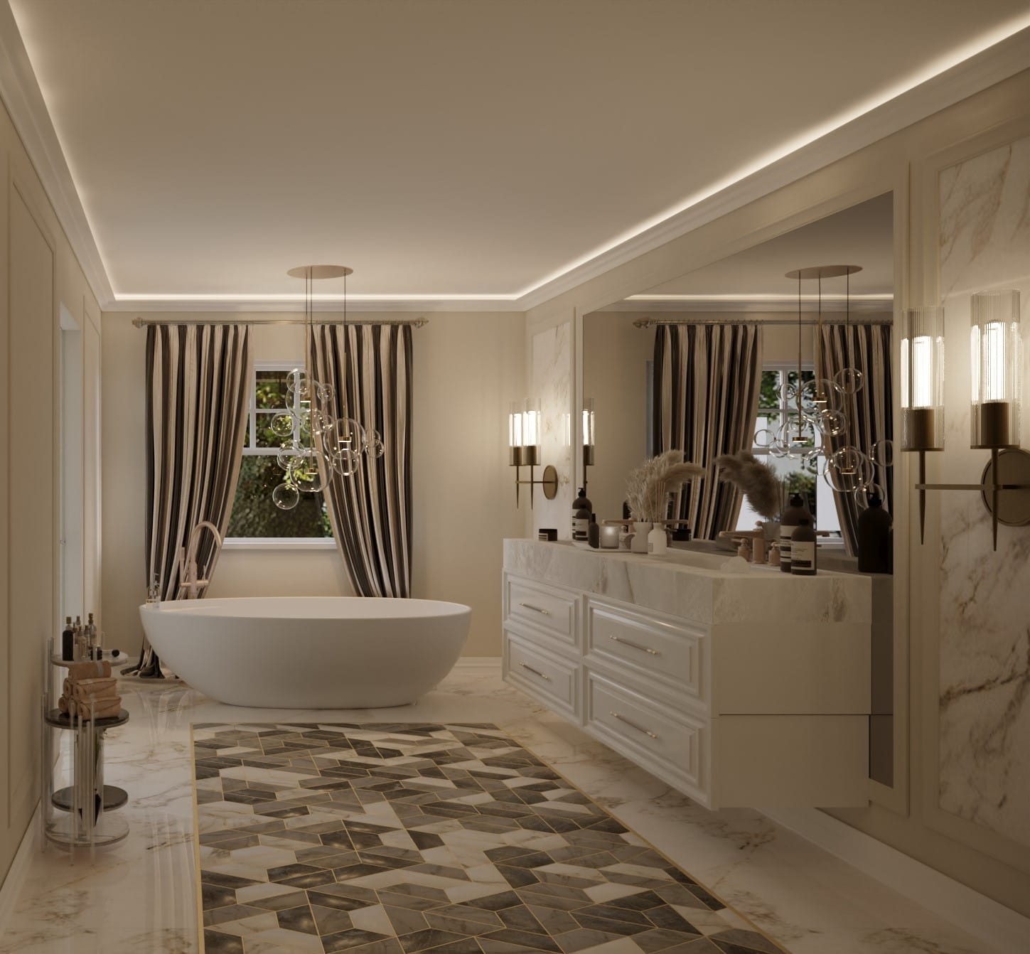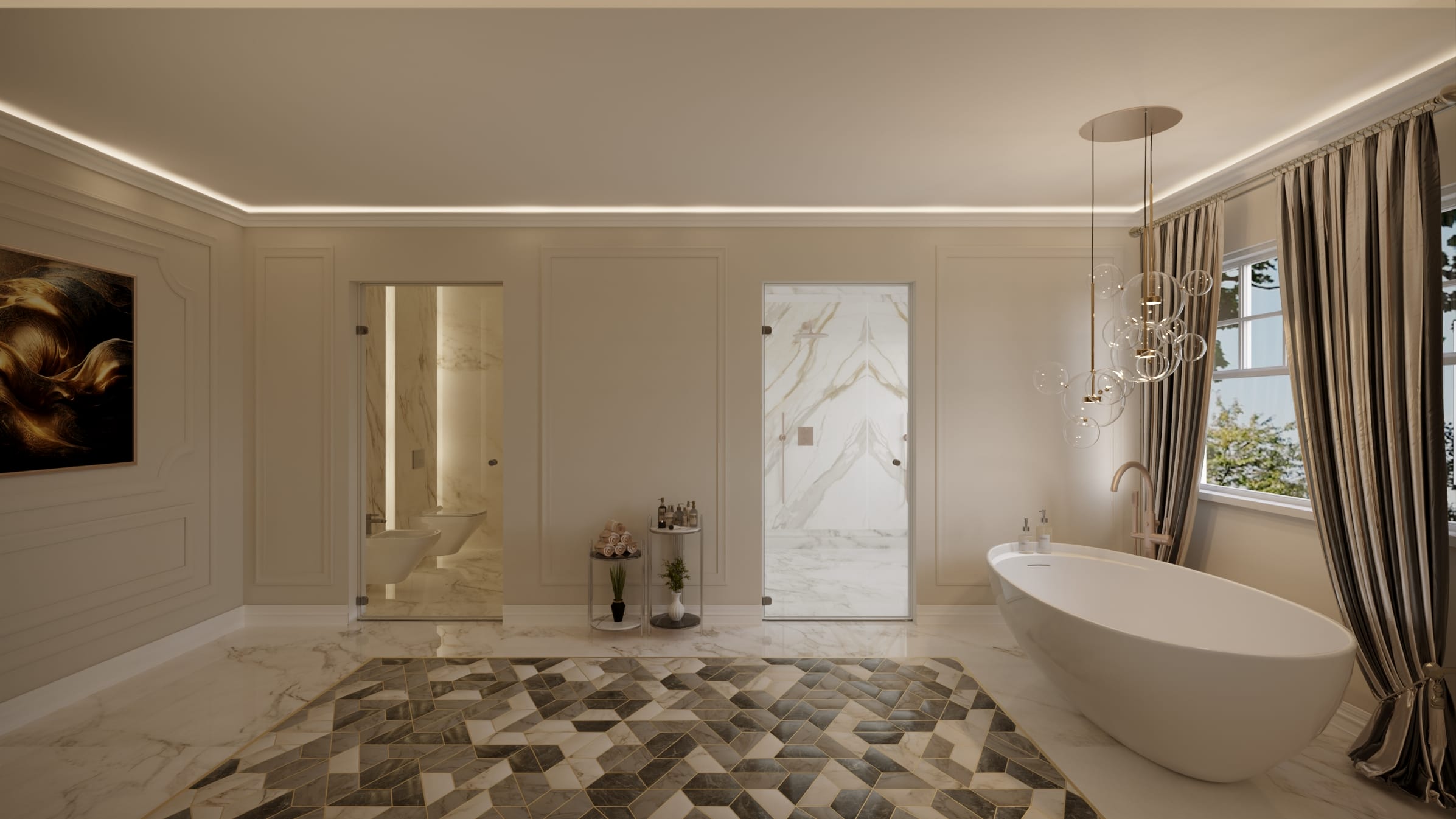 Our client came to us with one simple request: they wanted a neutral and calming space. We achieved this by carefully selecting tiles from the Torano Gold collection to grace the walls as well as opting for a stunning gold chandelier from J Adams to emphasise the warm and peaceful ambience in the room. The bespoke white vanity adds a functional layer to the space while serving as a statement piece, tailored precisely to the clients’ needs. Furthermore, the Gessi brushed bronze brassware additionally infuses the space with warmth and sophistication.