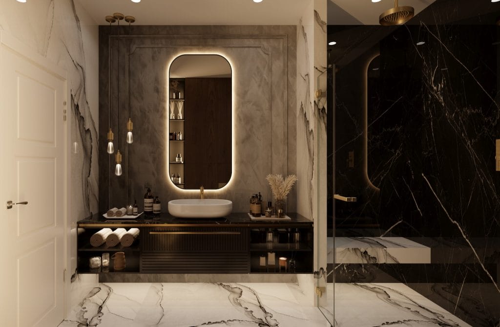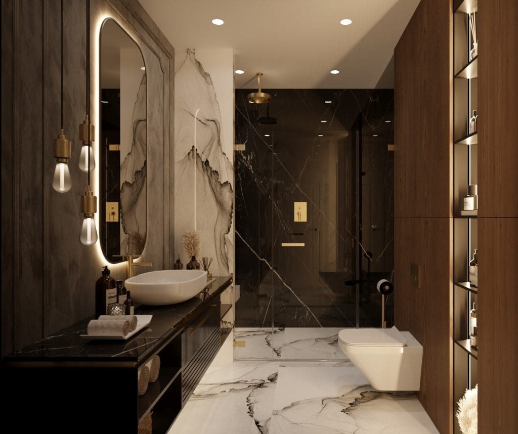 This breathtaking scenery and location by the sea is reflected in the luxury interior design which feels opulent and elegant. Our client’s vision was brought to life with the exquisite touch of Venetian plaster adorning the walls, infusing the space with a timeless allure seamlessly blending with it contemporary sophistication. The carefully selected brushed gold brassware from luxury designer, Gessi, adds an element of decadence and refinement. Completing this stunning design are the J Adams light fixtures casting a warm and enchanting glow.