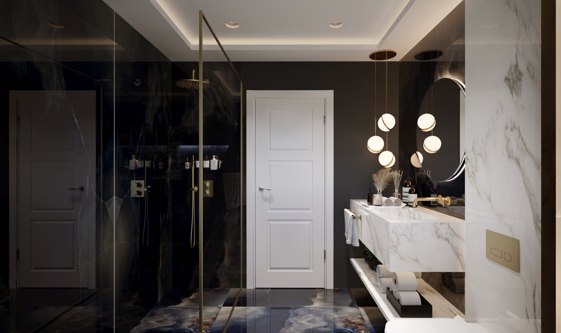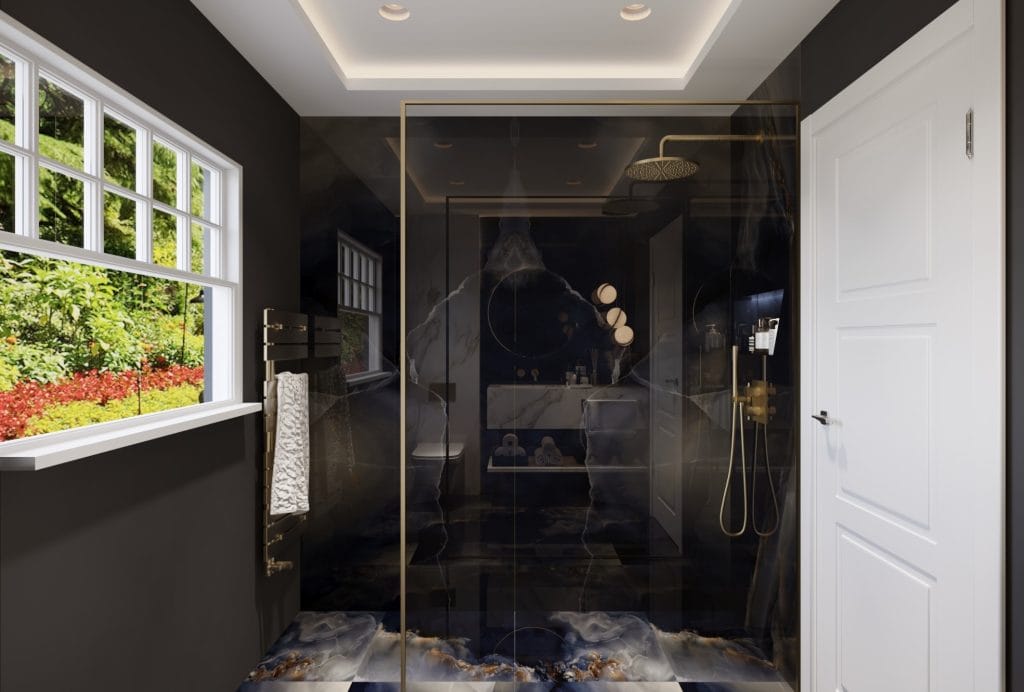 For this bathroom design below, we opted for space onyx tiles to set the tone for opulence, creating a space that exudes a sense of refined elegance. Our bespoke vanity unit and basin, meticulously tailored to the client’s unique preferences and dimensions, stand as exquisite focal points in the design, seamlessly marrying form and function.