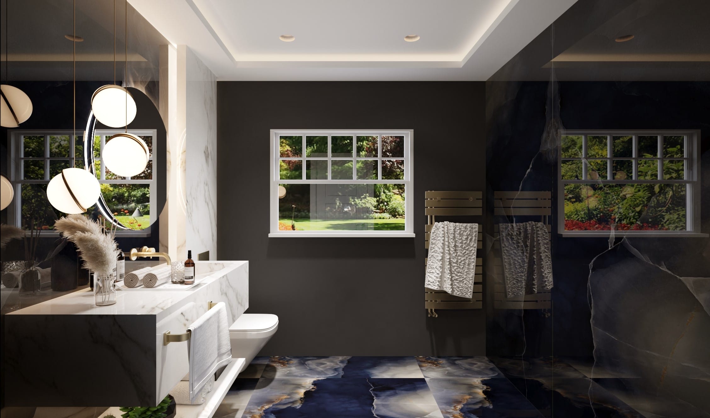 Illuminating this ensuite bathroom are the mini crescent pendant light fixtures, casting an ambient glow that enhances the atmosphere of tranquillity. Carefully chosen to complement the design, these fixtures are not merely sources of light but integral elements in creating a harmonious visual experience.