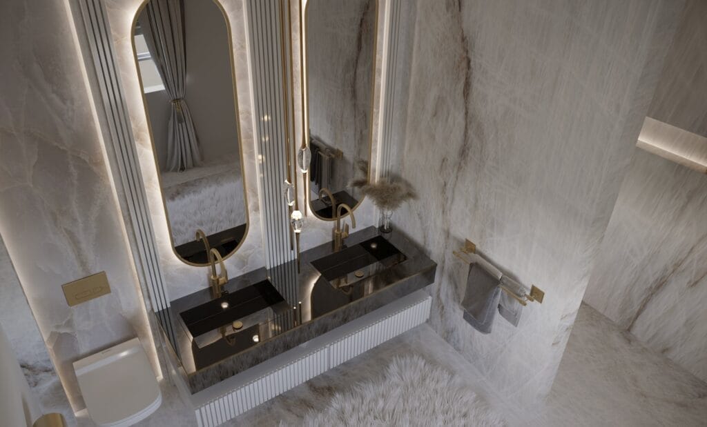 A standout feature is the bespoke double basin vanity, handcrafted in Sahara Noir porcelain—a dramatic black surface marked by golden veining. This integrated basin is framed by a floating drawer unit with a ribbed, lacquered front, providing both functionality and sculptural beauty. Above, the large oval mirrors, also framed in brushed brass, are set against a wall dressed in fluted vertical panels, and further enhanced by backlit LED lighting, creating depth and elegance.
